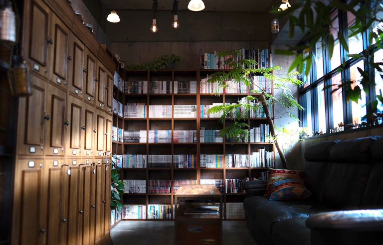 内装にもこだわり、大きな本棚や植物など、